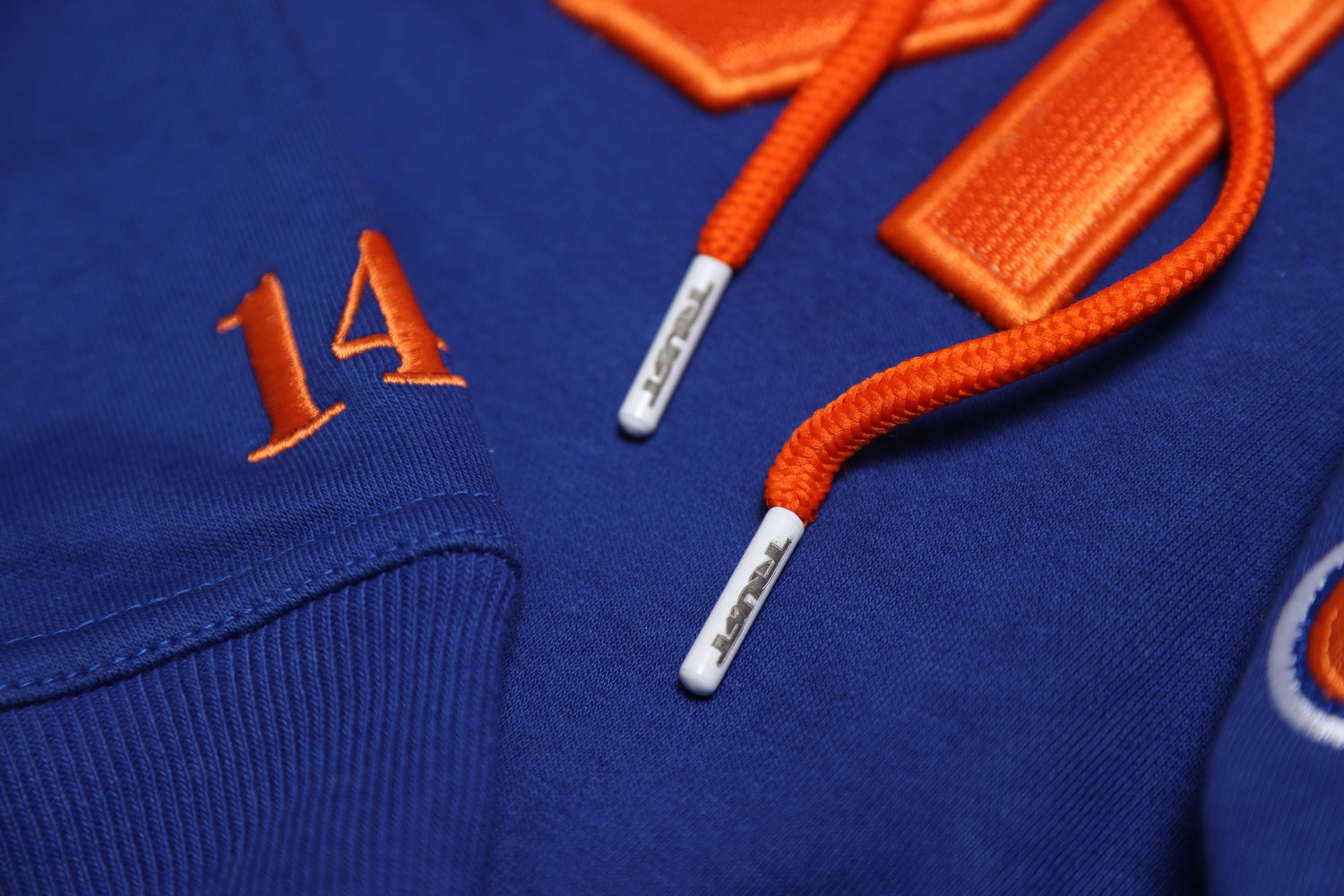 This cut and sew garment features an orange inner hood, orange drawstrings with TRUST logo on the aglets, and four embroidered elements: raised TRUST logo in orange on the front, CEP’s “Interstate 38” album cover design on the back, Spesh's sport jersey inspired logo on the left shoulder, and the edition number on the right sleeve.