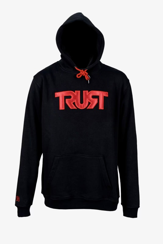This premium quality cut and sew garment features three embroidered elements: raised TRUST logo in red on the front, CEP’s “Stabbed & Shot” album cover design on the back, and the edition number on the right sleeve. To compliment the embroidery, the hoodie has red drawstrings with the TRUST logo on the aglets.