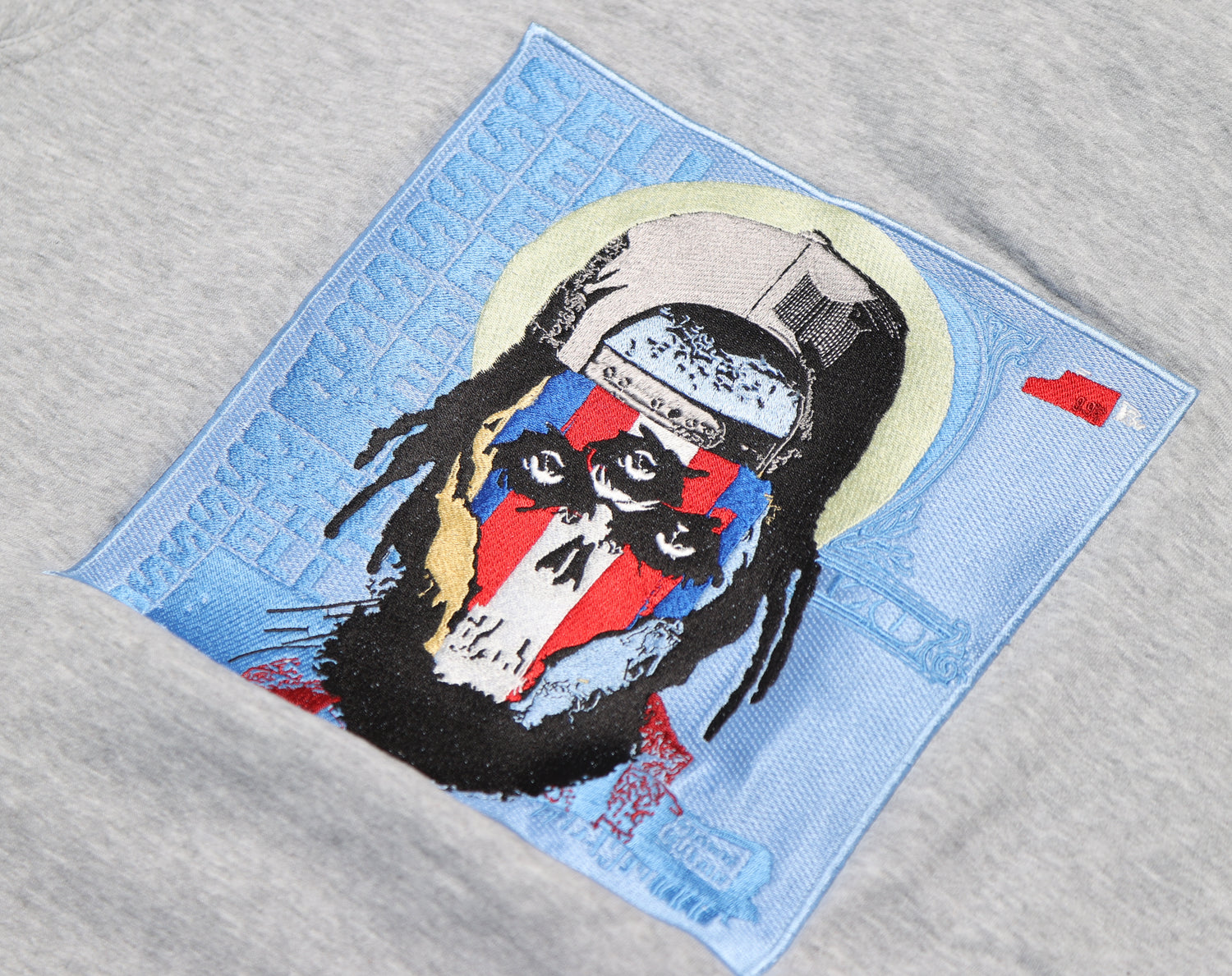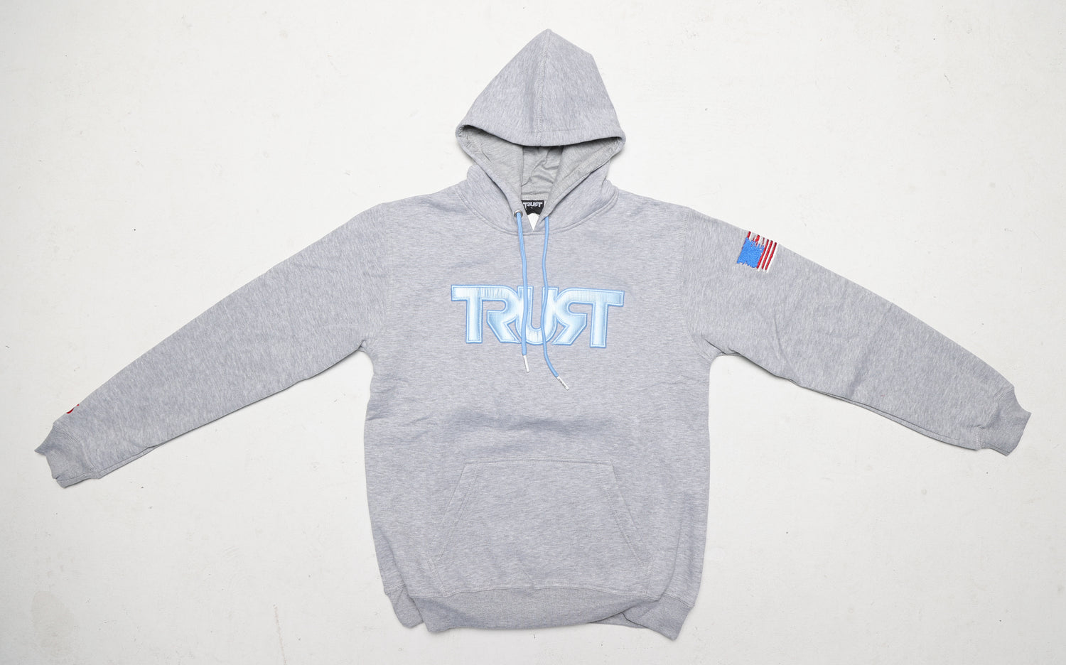 This cut and sew garment features four embroidered elements: raised TRUST logo in North Carolina blue on the front, CEP’s “RocAmeriKKKa” album cover design on the back, the “RocAmeriKKKa” American flag on the left shoulder, and the edition number on the right sleeve. To compliment the embroidery, the hoodie has North Carolina blue drawstrings with the TRUST logo on the aglets.